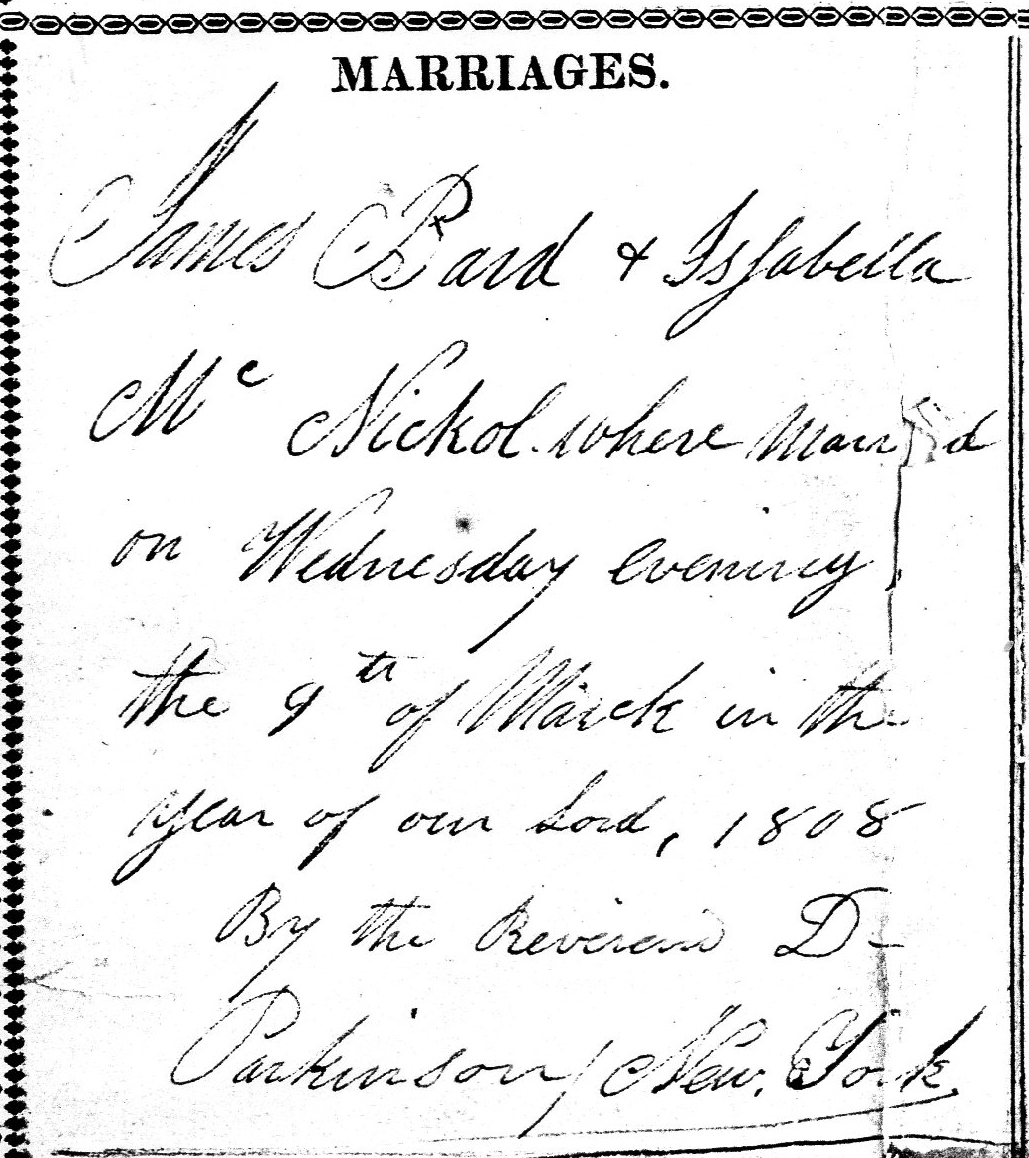 Below is a church record from the current First Baptist Church of New York City. It shows that James Beard was married to Isabella Nichols on March 9, 1808 (second line from the bottom). This is concrete confirmation that he initially went by the surname Beard. There are many variations of the spelling of Isabella's last name; it has been handed down to her descendants as "McNichol," not "Nichols."