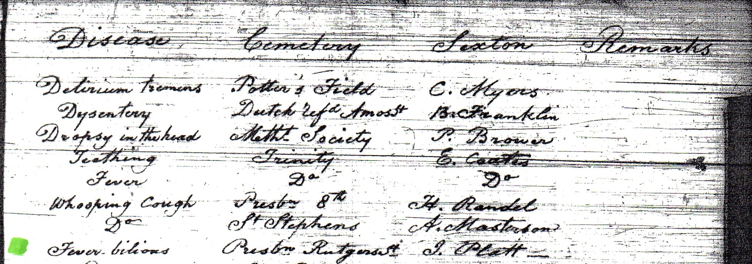 As indicated in the death record, James was buried in the Presbyterian Cemetery on Rutgers Street. They stopped burying people in that cemetery in 1851 when a ban on burials below 86th Street in Manhattan was instituted. And then between 1856 and 1865 most of the remains and gravestones were moved from that cemetery to two cemeteries in Brooklyn – Cypress Hills Cemetery and The Evergreens Cemetery. To date no records have been found of a James Beard or James Bard at either of those Brooklyn cemeteries.